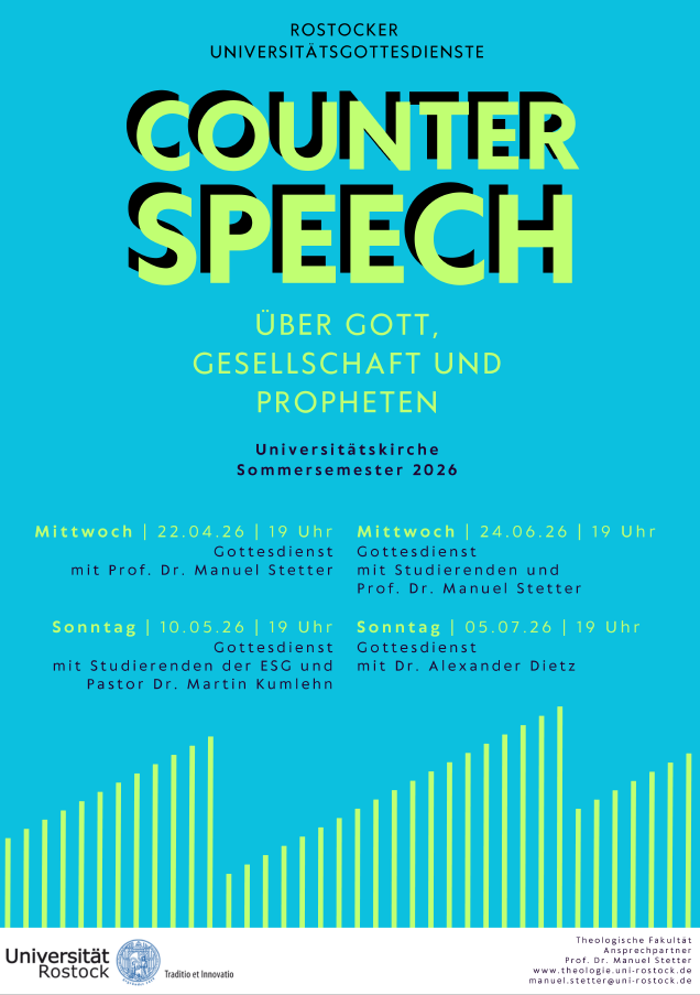 Universitätsgottesdienst SoSe'26 22.04.2026, 19:00 Uhr COUNTER SPEECH - über Gott, Gesellschaft und Propheten Weitere Informationen Kontakt: Prof. Dr. Manuel StetterTheologische FakultätTel.: +49 177 8233477 manuel.stetteruni-rostockdeOrganisatorTheologische FakultätVeranstaltungsortUniversitätskircheKlosterhof 718055 Rostock Termin speichern Zurück zu allen Veranstaltungen